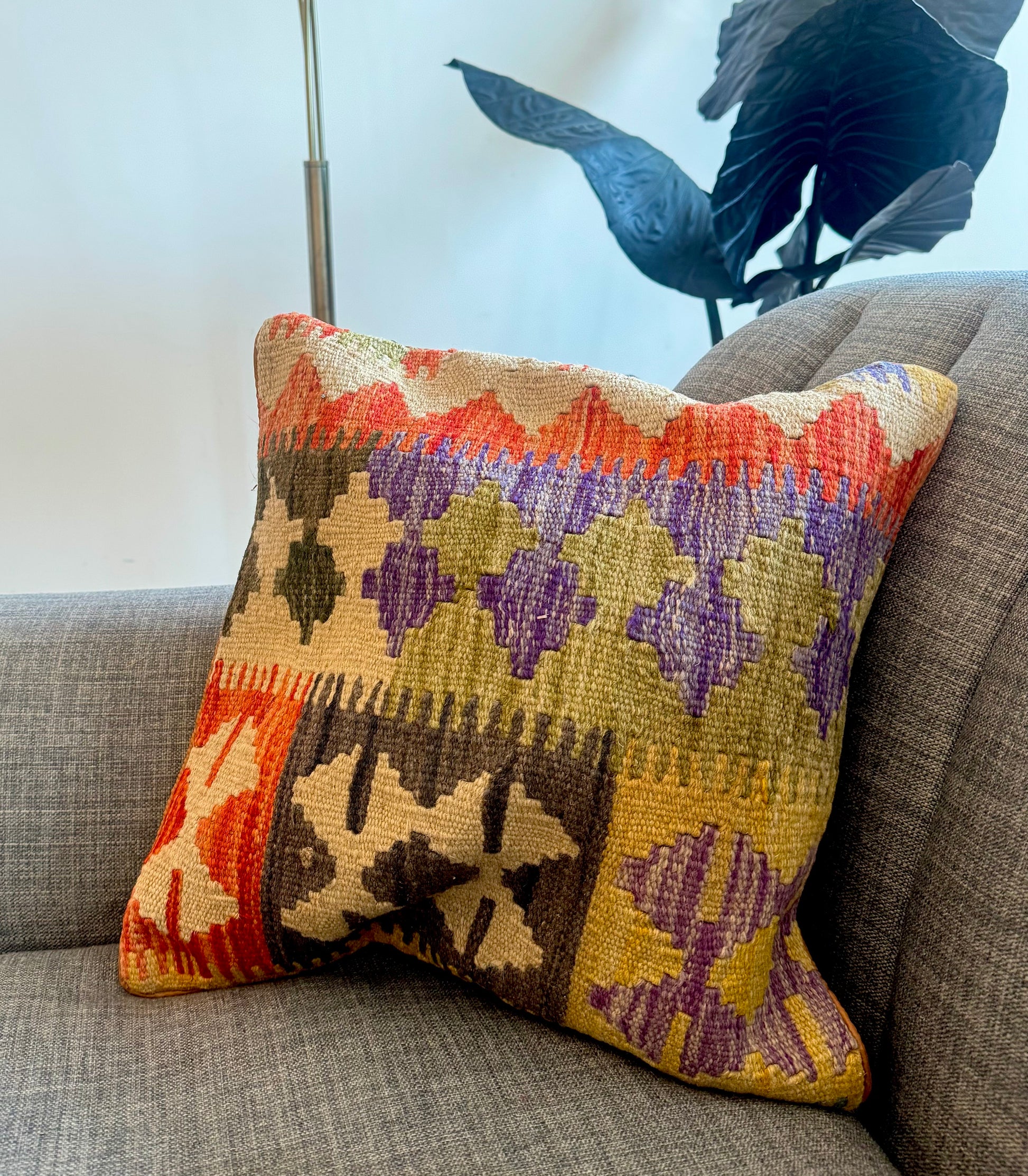 Handwoven from authentic kilim textiles, this cushion cover blends tradition with contemporary design. Bold geometric patterns, rich textures, and earthy hues make it a statement piece, while the handmade quality guarantees uniqueness.