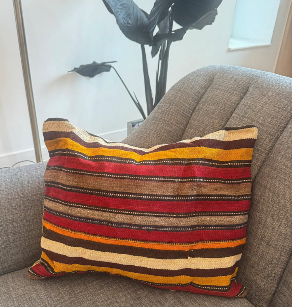 Ignite your space with the bold energy of the Crimson Flame cushion. Handwoven in vibrant red, orange, and black stripes, each piece showcases traditional kilim craftsmanship with a modern, striking twist. Perfect for adding warmth, texture, and a statement of color to any room.